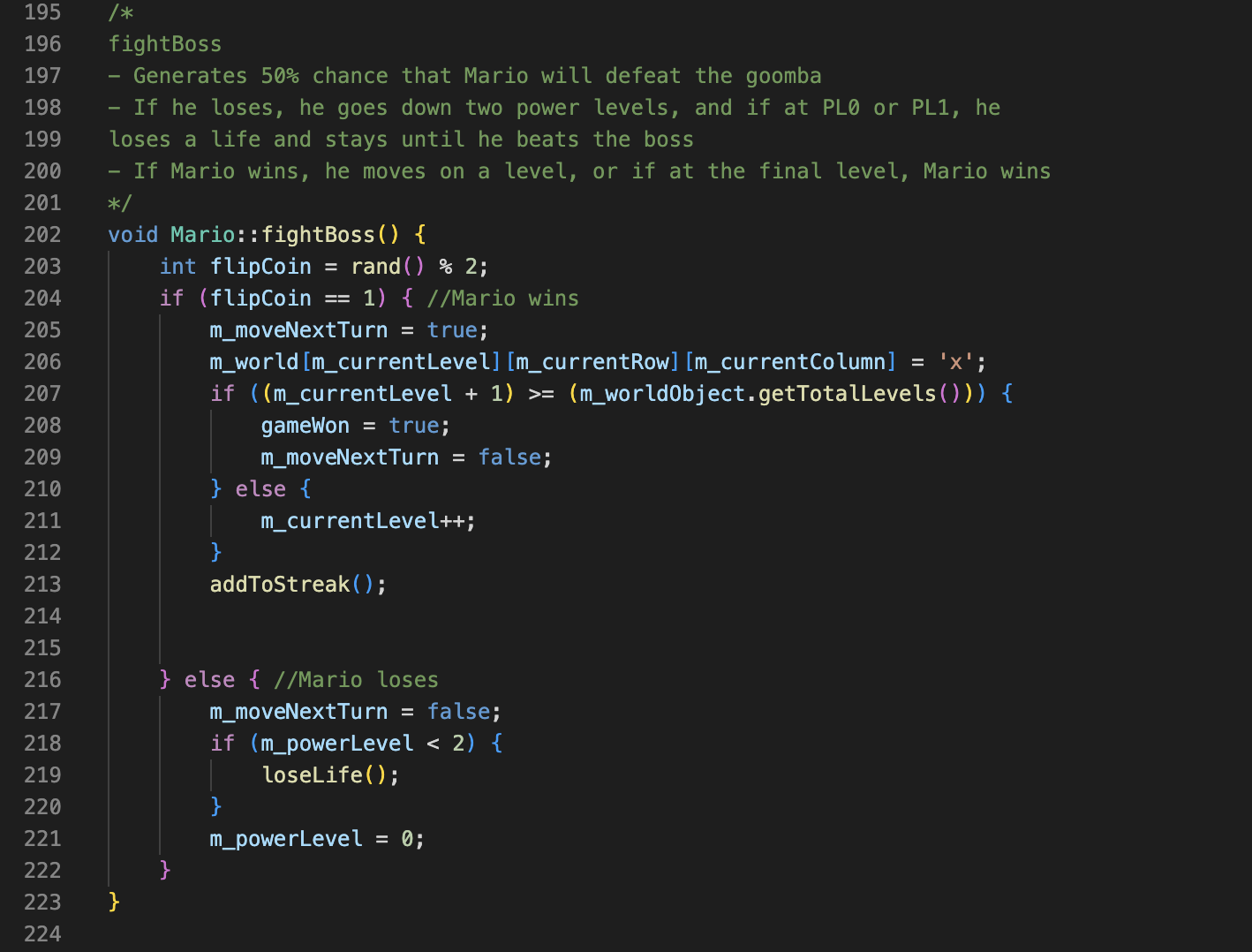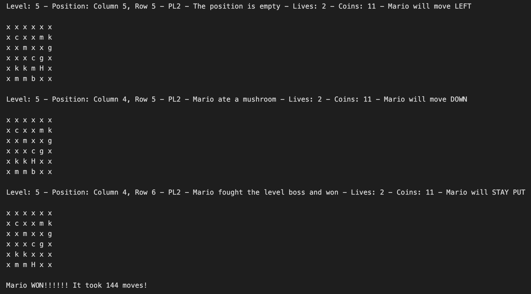Mario Bros. Log is a C++ program that takes in a text file of user-specified enemy and level numbers, writing a complete simulated game of Mario turn-by-turn to a log.txt file. This was completed individually fall 2023 for my Data Structures and Algorithms course. The program implements a 3D character array world containing levels, bosses, enemies, and coins, each turn invoking different status effects and actions for Mario that determine the outcome of the game. Personal focuses of this project included dynamic allocation, memory management, debugging, and time management.