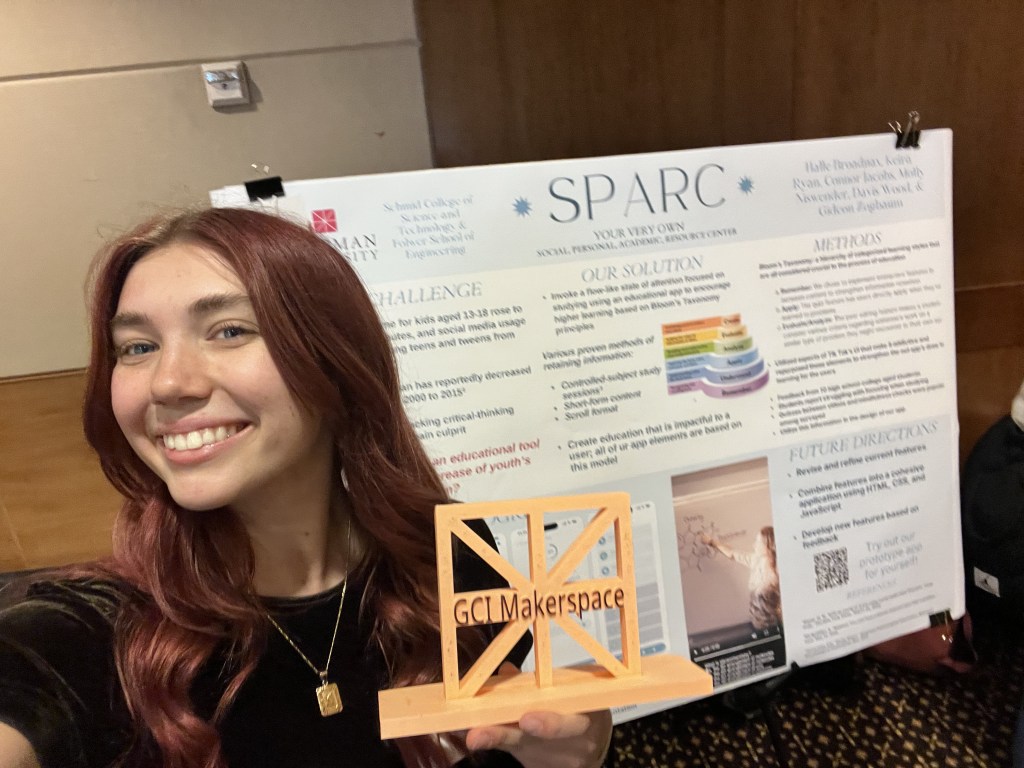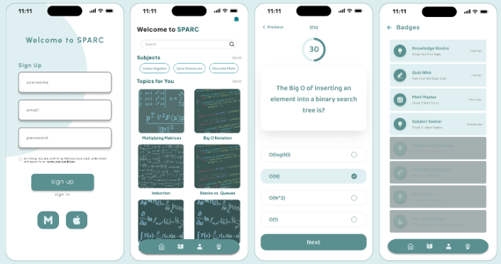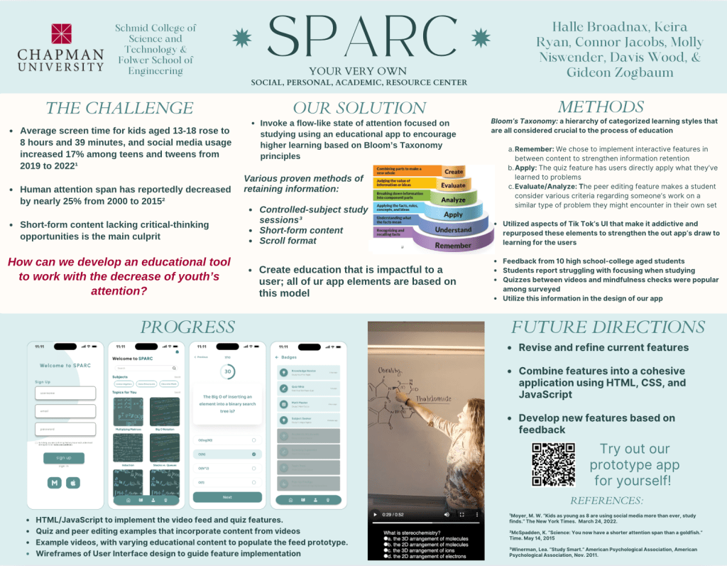 SPARC is a prototype educational app designed to work with the declining attention spans of today’s youth. The app is centered around controlled-subject study sessions composed of short-form learning modules in a scroll format. Our group met with educational researchers, received student input, and referenced scientific, published articles to devise our approach. Referencing the Bloom’s Taxonomy education model, our core mechanics – videos, quizzes, and peer evaluations – center around key levels of Bloom’s hierarchy: Remember, Apply, and Evaluate/Analyze. SPARC was completed as a part of Chapman University’s Grand Challenges Initiative program, winning the first prize in the Technology & Education category. Our poster, included in the photos below, contains Figma wireframes, the foundation or our research, and our prototype.